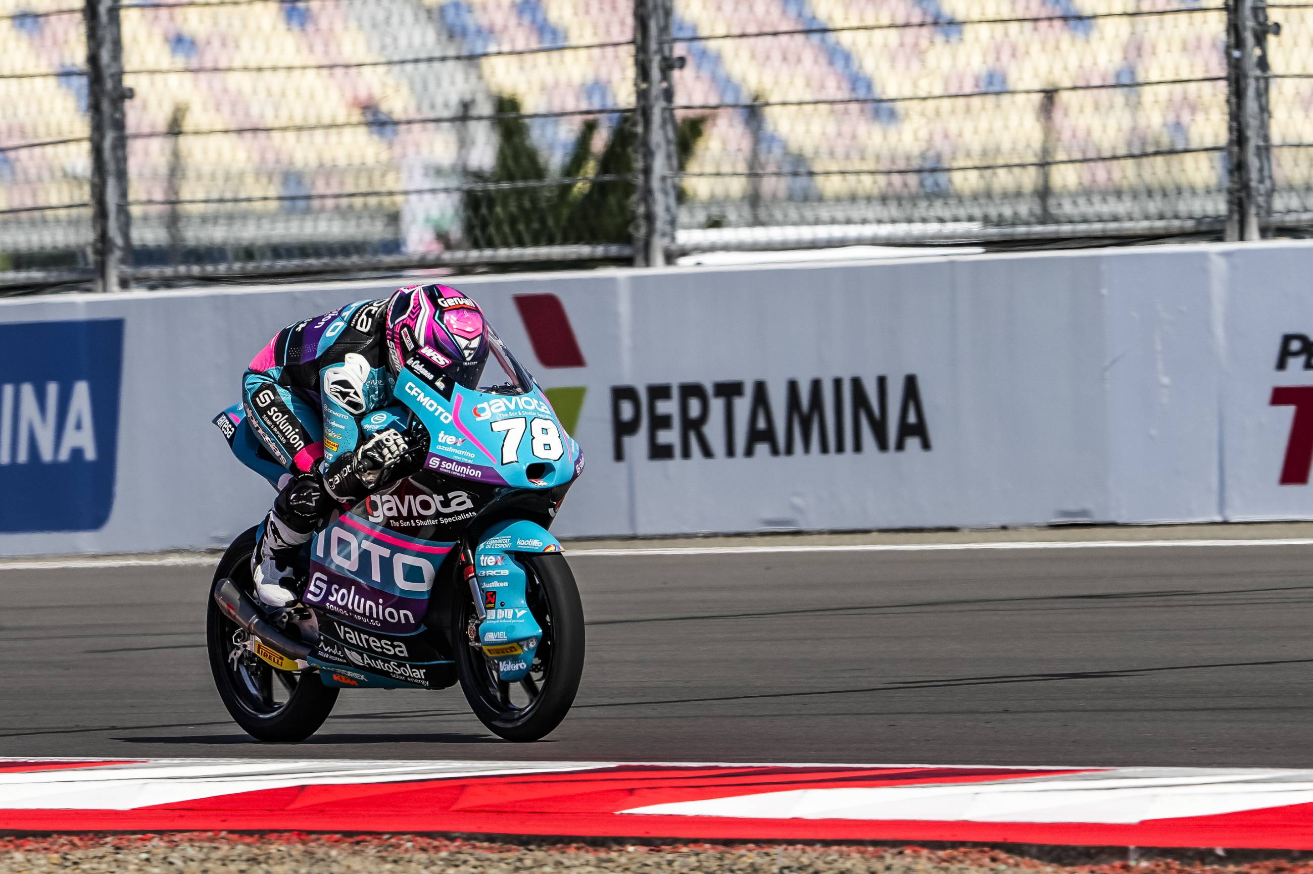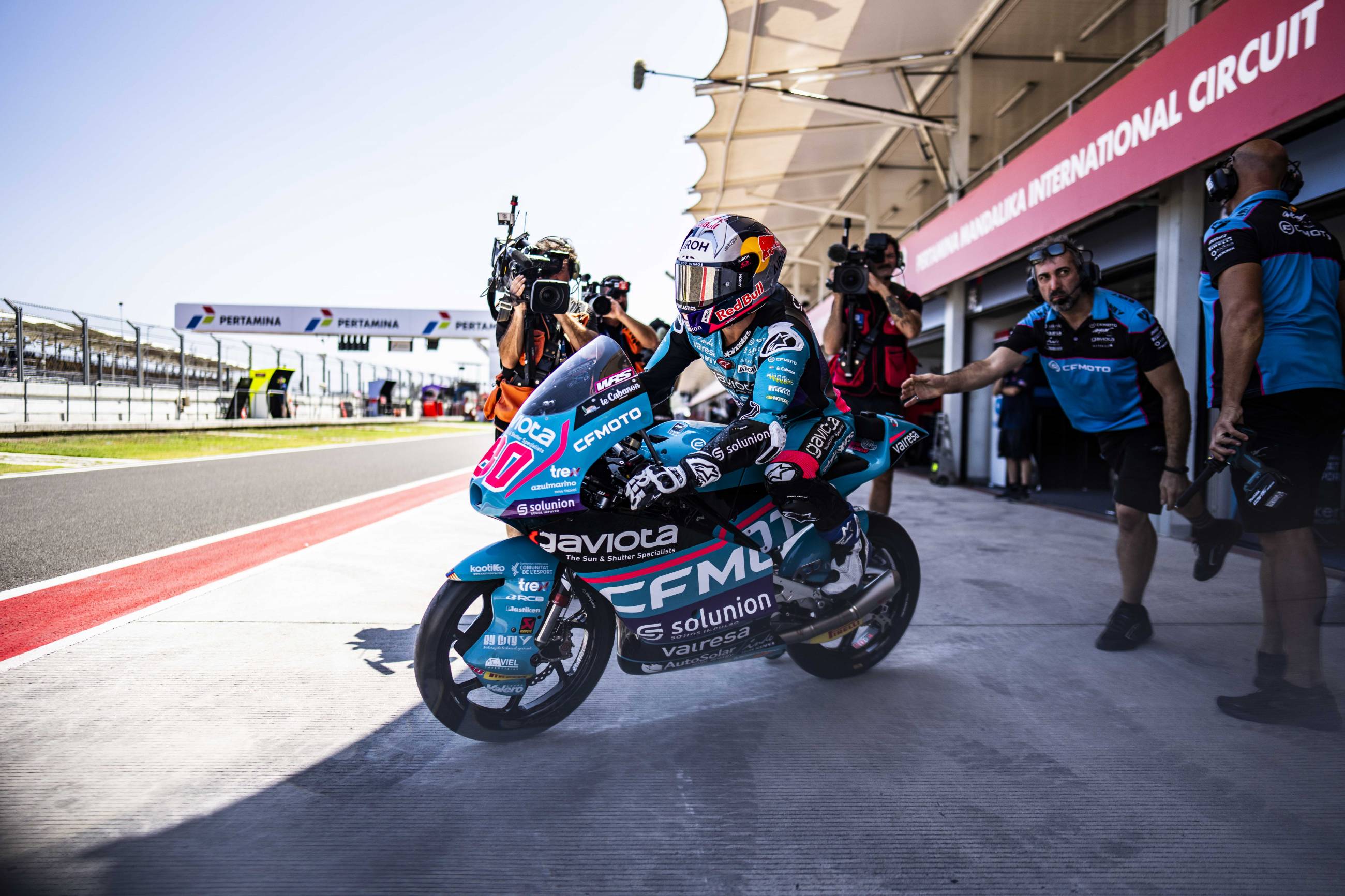 El piloto del CFMOTO Gaviota Aspar Team David Alonso comenzará el Gran Premio de Indonesia desde la segunda fila de parrilla. Después de un viernes complicado en Mandalika, Alonso ha dado un paso al frente en el último entrenamiento libre al lograr el quinto mejor registro de la sesión, un tiempo que le ha permitido entrar directamente en la Q2. En la clasificación, Alonso ha arrancado muy fuerte y, en su primer intento, ha logrado un crono de 1:38.072, un registro que ha sido capaz de mejorar hasta el 1:37.845 en su siguiente giro. Con este crono, Alonso se ha puesto al frente, marcando así la referencia en los primeros minutos de la sesión. Sus rivales no han tardado en superar su apuesta y el líder del Mundial ha caído hasta la cuarta posición en la tabla de tiempos, por detrás de Iván Ortolá, Collin Veijer y Adrián Fernández. Tras una breve parada en boxes, los pilotos de la categoría pequeña han vuelto a pista en los últimos minutos de sesión para completar un último intento en la lucha por la pole. Ortolá ha sido el más rápido y ha conseguido una pole de récord tras parar el crono en 1:37.332. El valenciano ha aventajado en dos décimas a Collin Veijer, que saldrá segundo, y en tres a Taiyo Furusato, que repite por segunda carrera consecutiva en la primera fila de parrilla. El piloto del CFMOTO Gaviota Aspar Team no ha podido mejorar su registro en su último intento y se ha quedado a cinco décimas de la pole. Mañana, Alonso luchará por conseguir su novena victoria de la temporada desde la segunda fila.