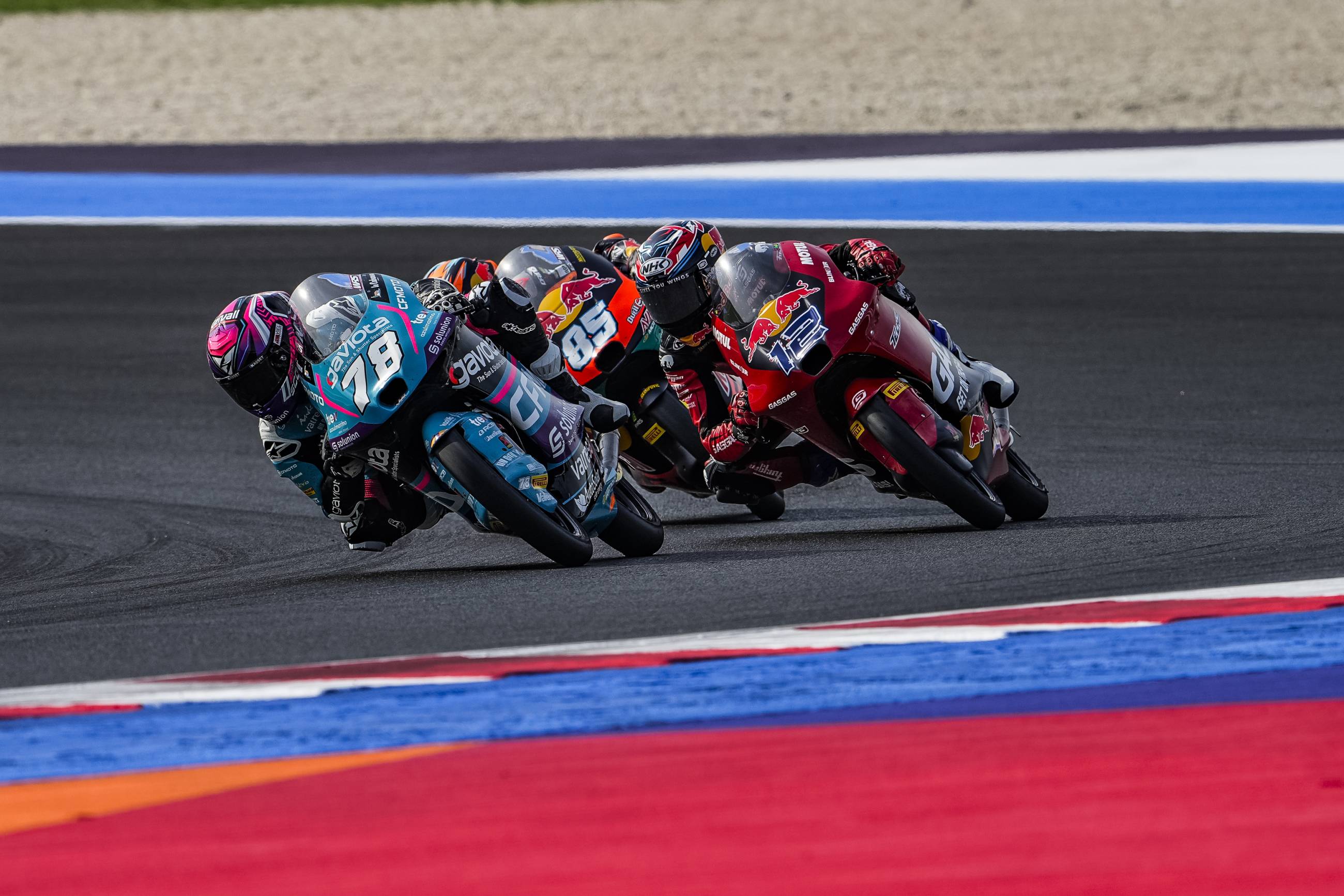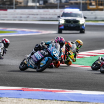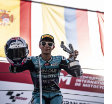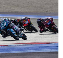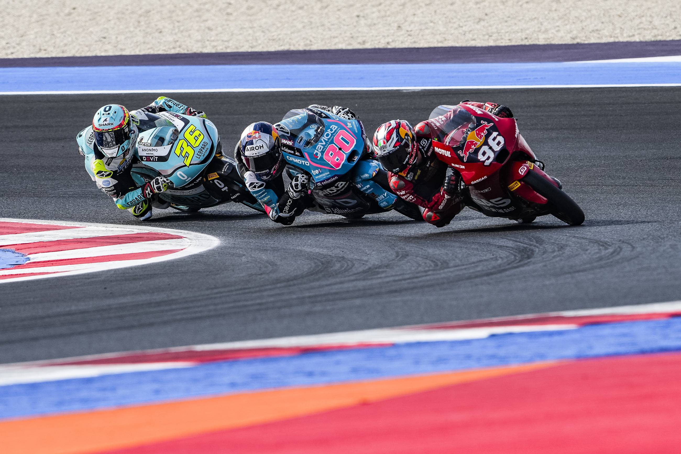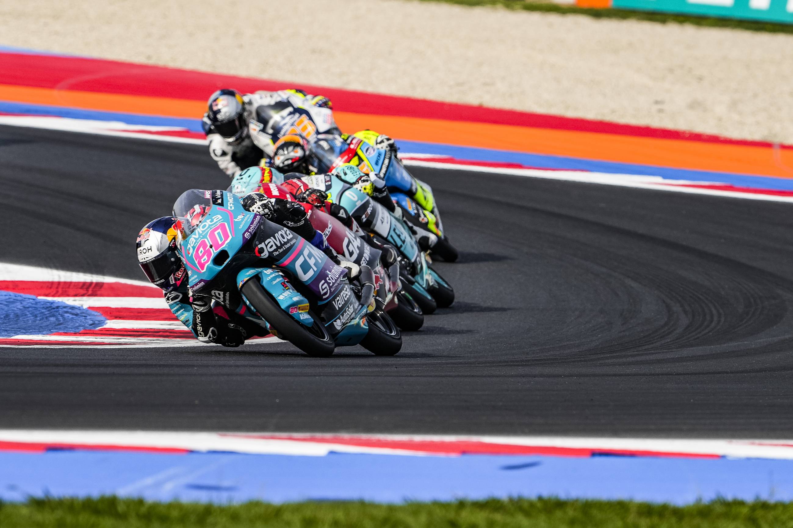 El piloto del CFMOTO Gaviota Aspar Team David Alonso llegó a Misano con el objetivo de resarcirse de la carrera aquí hace dos semanas y así lo ha hecho. Alonso ha ganado el Gran Premio de la Emilia - Romaña tras una última vuelta de infarto. El líder del Mundial ha mantenido la segunda posición en la salida e incluso ha liderado la prueba en los primeros giros. Sin embargo, la batalla por las plazas del podio ha sido un intercambio constante de posiciones entre un grupo muy numeroso de pilotos, lo que ha hecho que Alonso haya llegado a rodar en quinta posición. A falta de once vueltas para el final, Alonso ha superado a Dani Holgado para ponerse al frente. Desde ese momento, el colombiano ha impuesto su ritmo para tratar de romper el grupo y así lo ha conseguido, aunque le han seguido otros tres pilotos: Dani Holgado, Ángel Piqueras y Collin Veijer. Pese a que las distancias entre estos cuatro pilotos han sido mínimas, las posiciones se han mantenido estables hasta la penúltima vuelta, cuando Holgado y Piqueras han superado a Alonso. Sin embargo, Alonso aún no había dicho su última palabra. En la última vuelta, ha completado un doble adelantamiento magistral para recuperar la primera posición y lograr así la victoria. Piqueras ha terminado segundo y, tras él, Holgado había cruzado la línea de meta tercero, pero ha excedido los límites de la pista en la última vuelta y le han sancionado con una posición, por lo que ha sido Veijer quien ha subido al tercer escalón del podio.