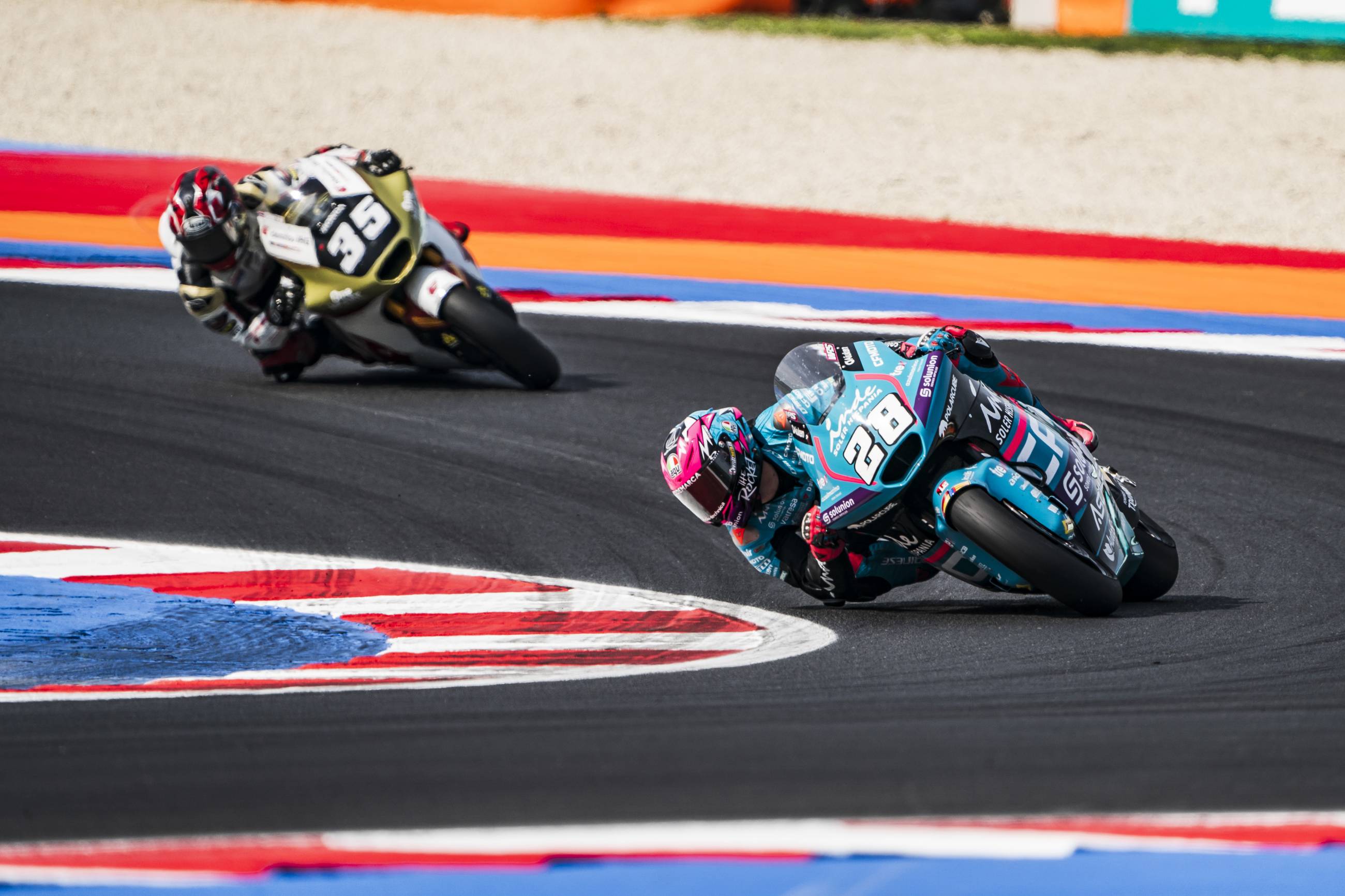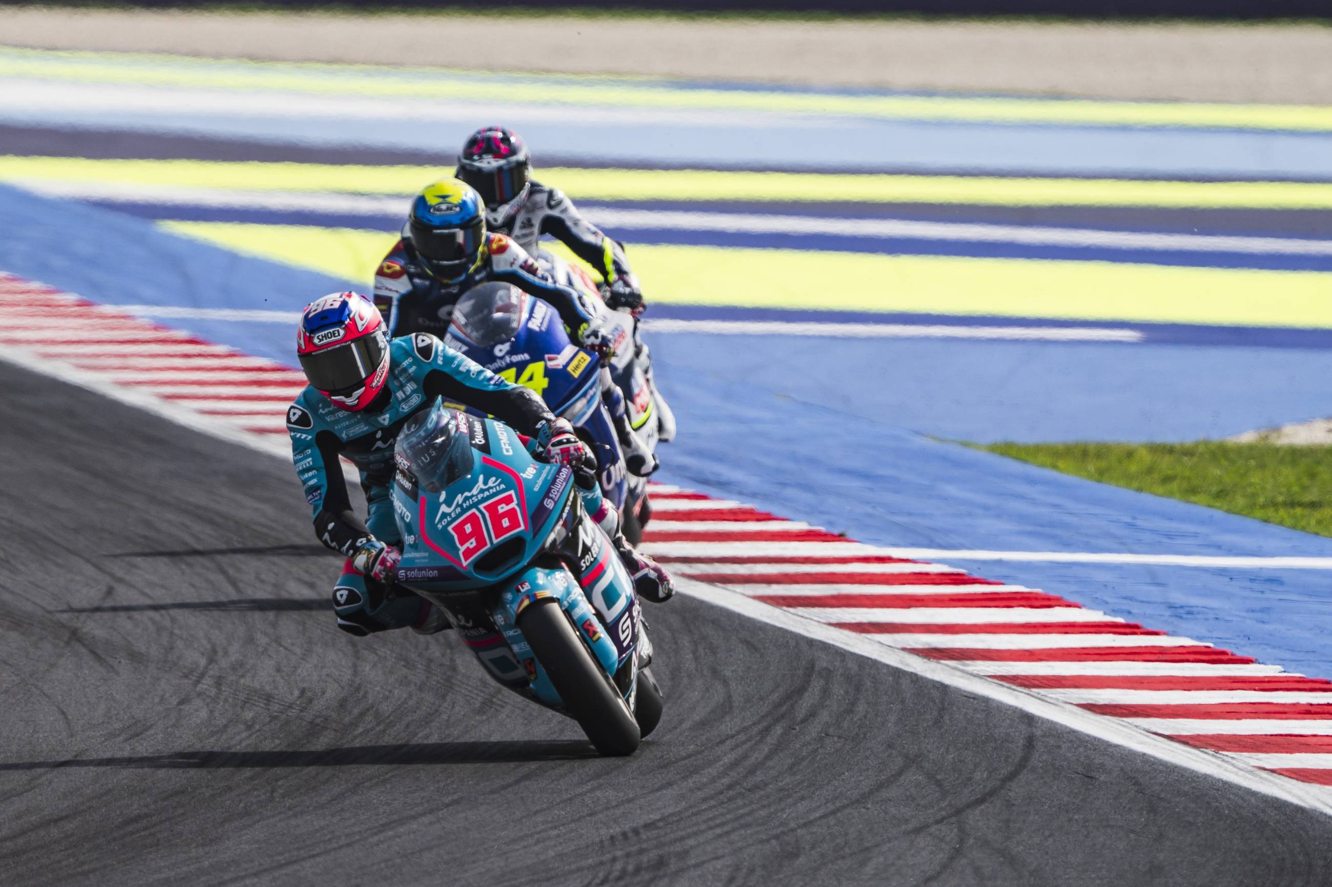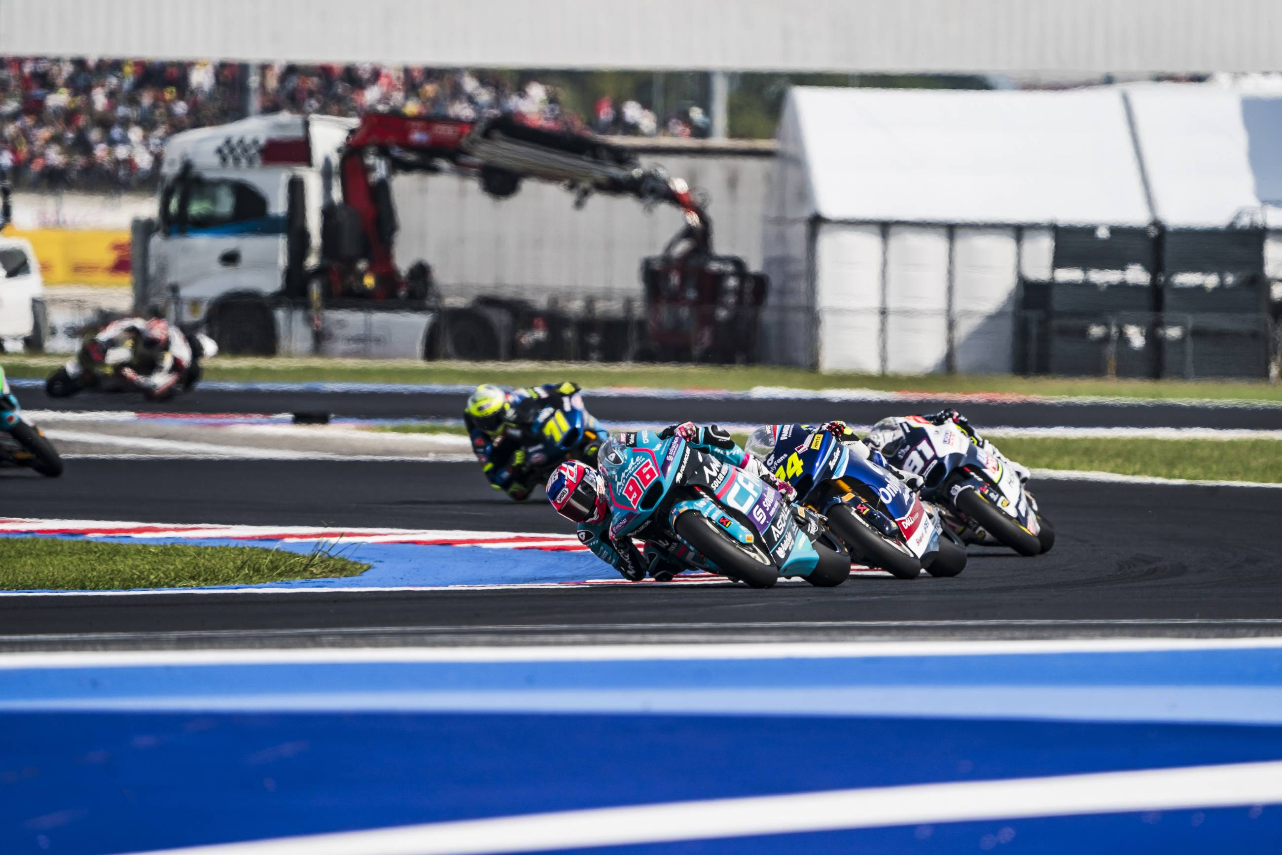 Celestino Vietti, Aron Canet y Tony Arbolino han sido los claros protagonistas de la carrera del Gran Premio de la Emilia – Romaña. Los tres pilotos han estado un paso por delante del resto en la carrera en el Misano World Circuit - Marco Simoncelli y se han repartido las tres posiciones de podio tras una dura pelea. Arbolino, que partía desde la tercera posición, ha cogido la cabeza de carrera en la primera vuelta y ha sido quien ha liderado gran parte de la prueba, con Canet y Vietti siguiéndole de cerca. A seis vueltas para el final, Canet y Vietti han mostrado sus cartas y ha comenzado el intercambio de posiciones entre los tres pilotos de cabeza. En el último giro, Arbolino ha tenido un problema con el cambio de marchas de su moto que le ha privado de luchar por la victoria hasta el final. Canet y Vietti han batallado hasta la línea de meta y ha sido el italiano quien ha logrado la victoria, con solo 29 milésimas sobre el valenciano. El líder del Mundial Ai Ogura ha terminado en cuarta posición, a casi tres segundos de la cabeza. Con esta cuarta plaza, el japonés ha aumentado su ventaja al frente del Mundial hasta los 22 puntos sobre su compañero de equipo Sergio García, quien ha sufrido una caída.