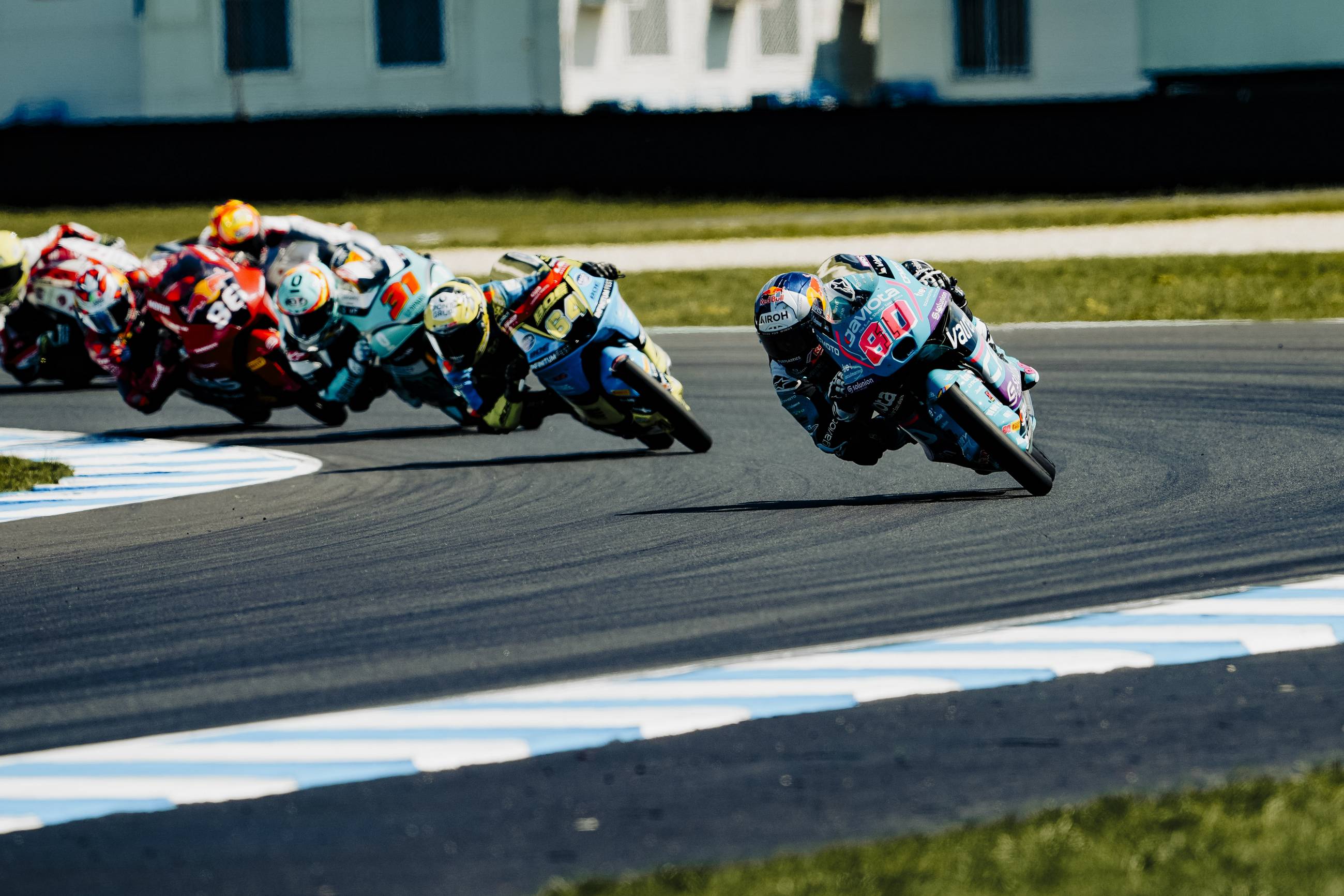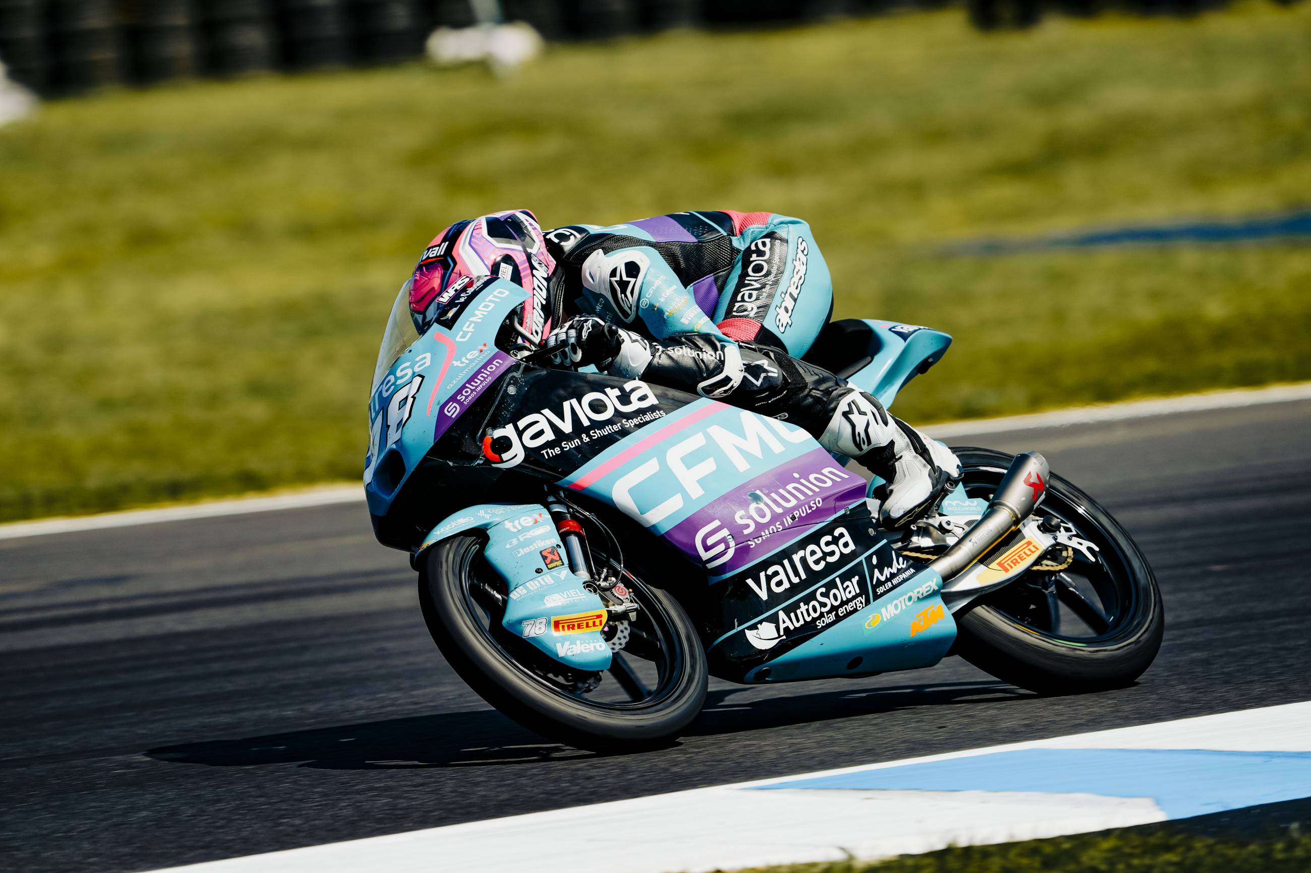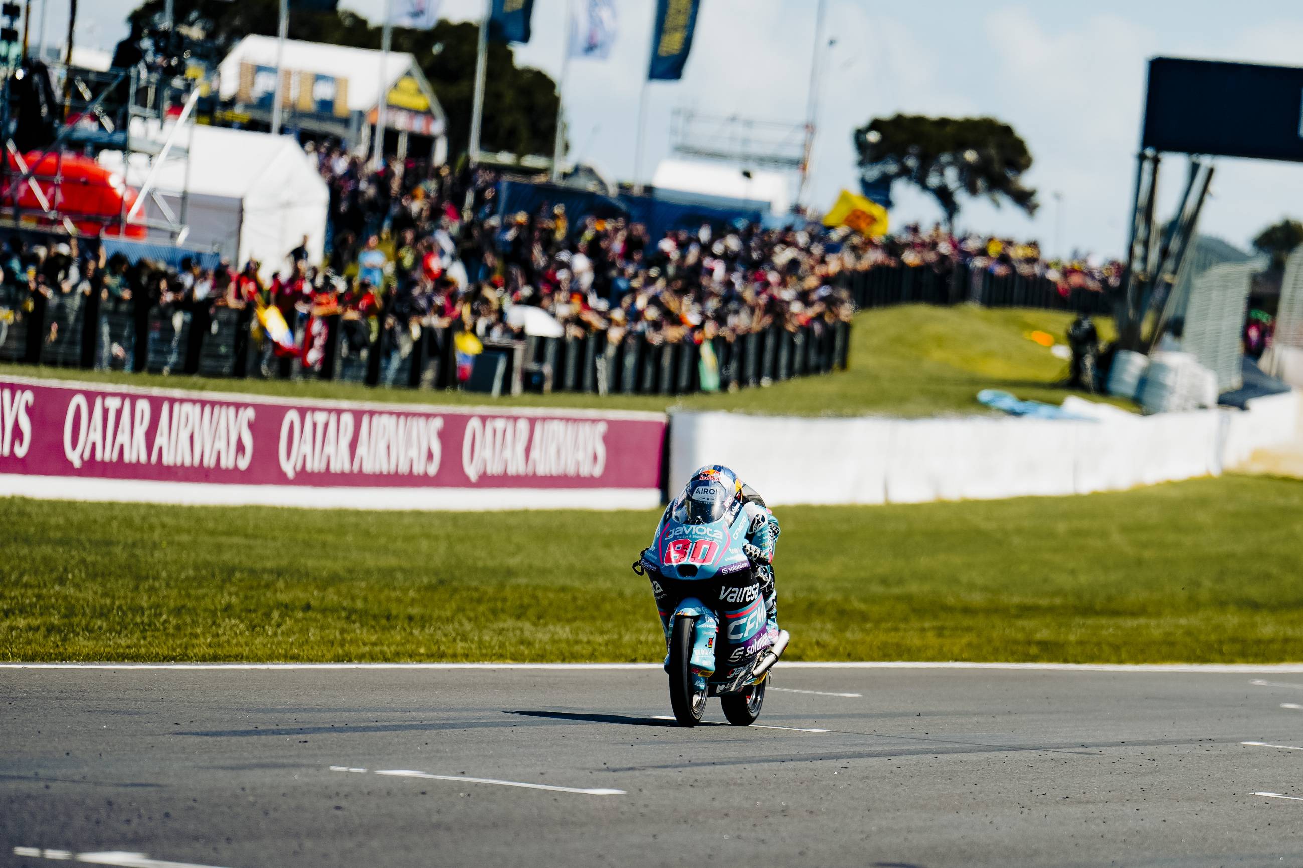 El piloto del CFMOTO Gaviota Aspar Team David Alonso sigue intratable en Moto3 y con su victoria en el Gran Premio de Australia ha igualado el récord de triunfos en la categoría pequeña de Valentino Rossi. El campeón del mundo ha protagonizado un gran remontada en Phillip Island y ha logrado su cuarta victoria consecutiva. Alonso partía desde la décima posición, pero eso no ha sido un problema para él. El piloto del CFMOTO Gaviota Aspar Team ha arrancado muy fuerte y en tan solo dos giros ya ocupaba la cuarta plaza. A partir de ese momento, el campeón del mundo ha permanecido siempre en las posiciones delanteras dentro de un primer grupo que ha estado formado por hasta trece pilotos. Durante toda la carrera, este grupo ha lidiado una intensa batalla, con un intercambio constante de posiciones. Sin embargo, Alonso se guardaba un as bajo la manga. A falta de cinco vueltas para el final, el colombiano ha adelantado a Adrián Fernández para ponerse primero, una posición que ya no ha abandonado hasta la bandera a cuadros. El piloto del CFMOTO Gaviota Aspar Team ha ido poco a poco abriendo hueco al frente y ha cruzado la línea de meta con casi tres segundos de ventaja sobre Dani Holgado y Adrián Fernández, que han completado el podio. El campeón del mundo ha celebrado su undécima victoria del año con una venda en la cabeza, emulando la celebración que hizo Rossi cuando estableció el récord de más victorias en la categoría pequeña en una temporada en el Gran Premio de Indonesia de 1997, una carrera en la que compartió podio con Jorge Martínez 'Aspar'.
