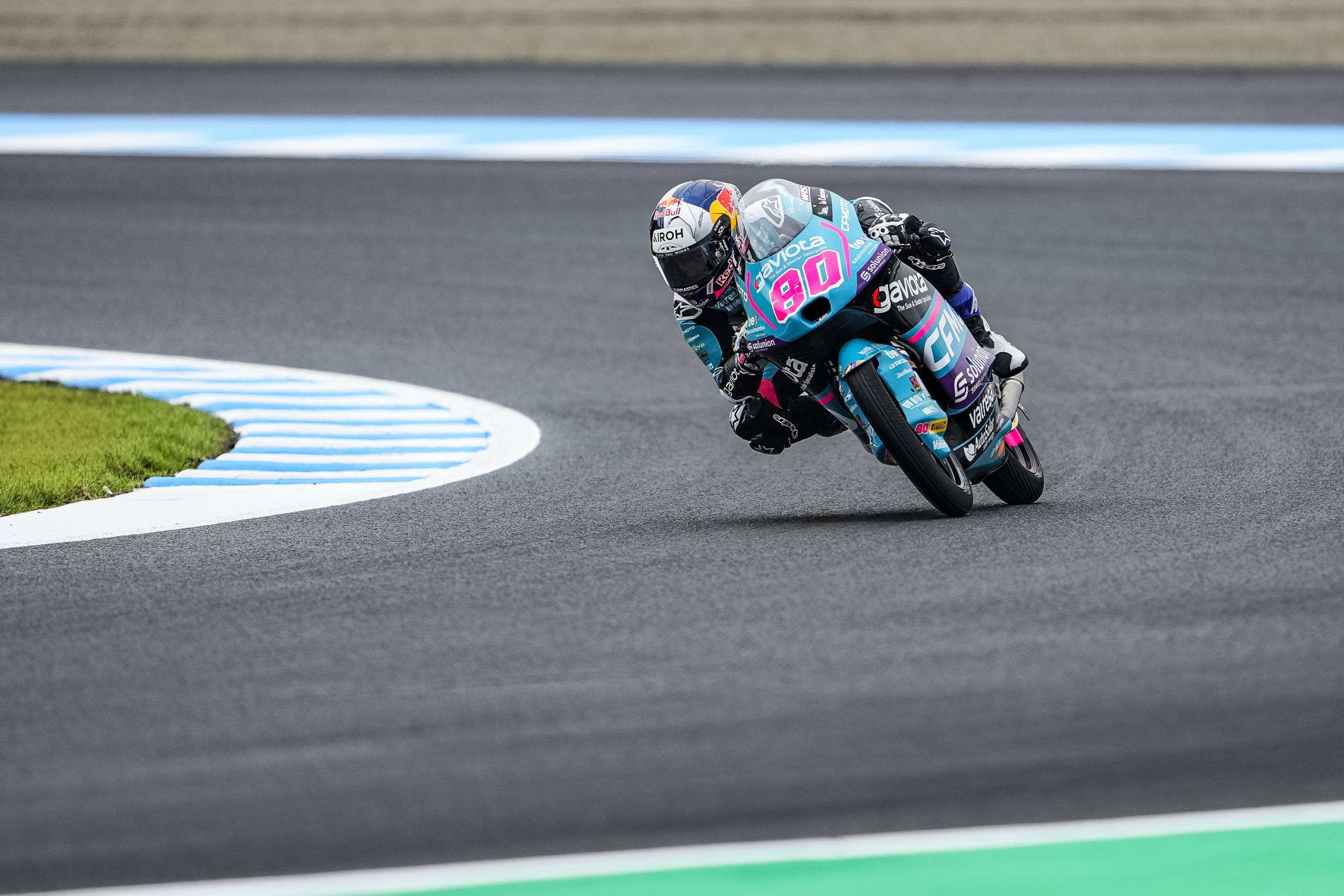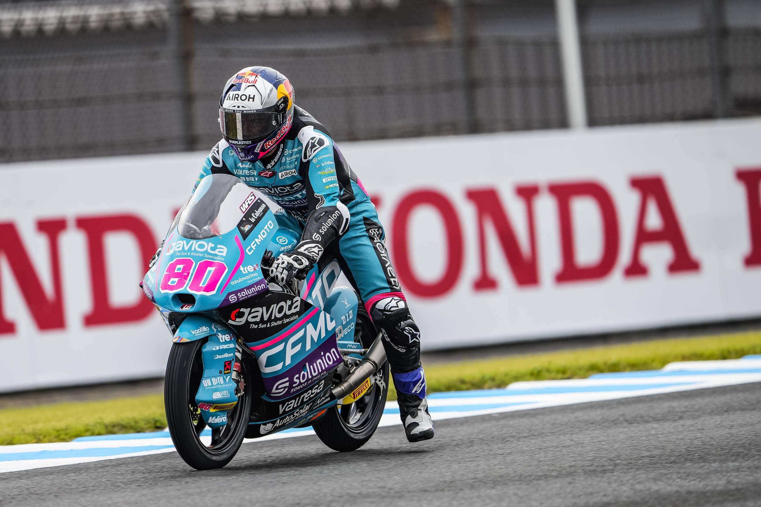 El Gran Premio de Japón, la decimosexta cita de la temporada, ya está en marcha. Menos de una semana después de la carrera de Indonesia, los pilotos de Moto3 han vuelto a pista y, un viernes más, el piloto del CFMOTO Gaviota Aspar Team David Alonso ha arrancado entre los más rápidos. La primera jornada en Motegi ha comenzado con niebla y con la pista mojada debido a la lluvia caída durante la noche, por lo que los pilotos de la categoría pequeña han empezado el gran premio con neumáticos de mojado. Conforme ha ido transcurriendo el primer entrenamiento, la pista se ha ido secando, lo que ha permitido que en los minutos finales hayan montado compuestos de seco y hayan rebajado notablemente los tiempos. En estas condiciones, el más rápido ha sido el piloto del CFMOTO Gaviota Aspar Team, que ha conseguido un crono de 1:59:280, con el que ha aventajado en dos décimas al segundo clasificado, Joel Kelso. Por la tarde, los pilotos han podido salir con gomas de seco desde el inicio, a pesar de que durante la mañana ha chispeado. Además, las condiciones de la pista han mejorado respecto a la primera sesión, lo que ha propiciado que se haya batido el récord del trazado. Hasta nueve pilotos han rodado por debajo del anterior récord, conseguido por Jaume Masiá la pasada temporada. La referencia la ha marcado Iván Ortolá, que ha conseguido un tiempo de 1:55:550. Tras él ha terminado el debutante Ángel Piqueras, a 157 milésimas, y el top 3 lo ha completado Alonso, a 167 milésimas. El líder del Mundial ha dedicado el primer día a trabajar tanto en el ritmo de carrera como en la velocidad a una vuelta. La previsión de lluvia en el entrenamiento de mañana ha hecho que terminar el día en posiciones provisionales de Q2 haya sido el objetivo.