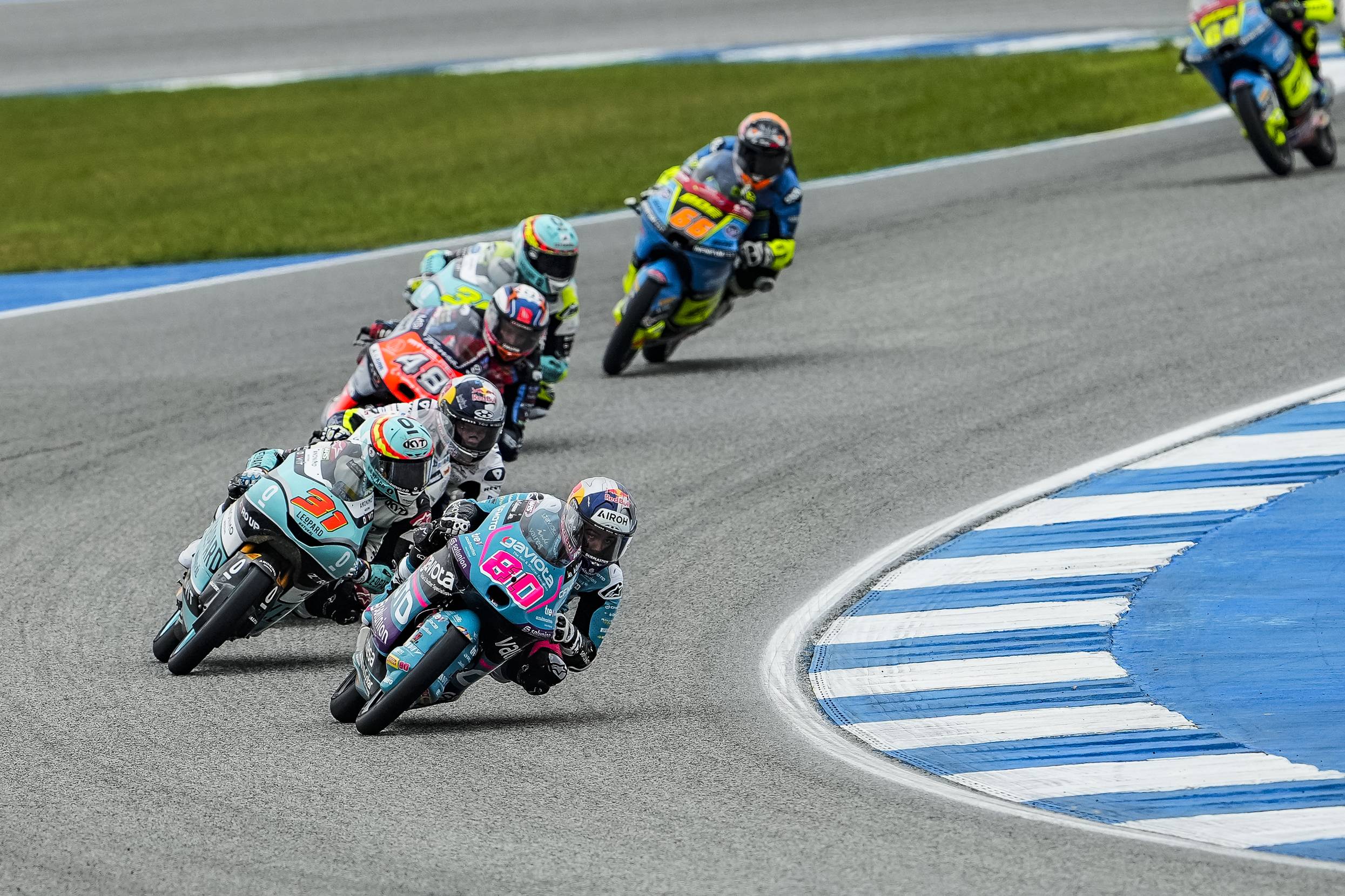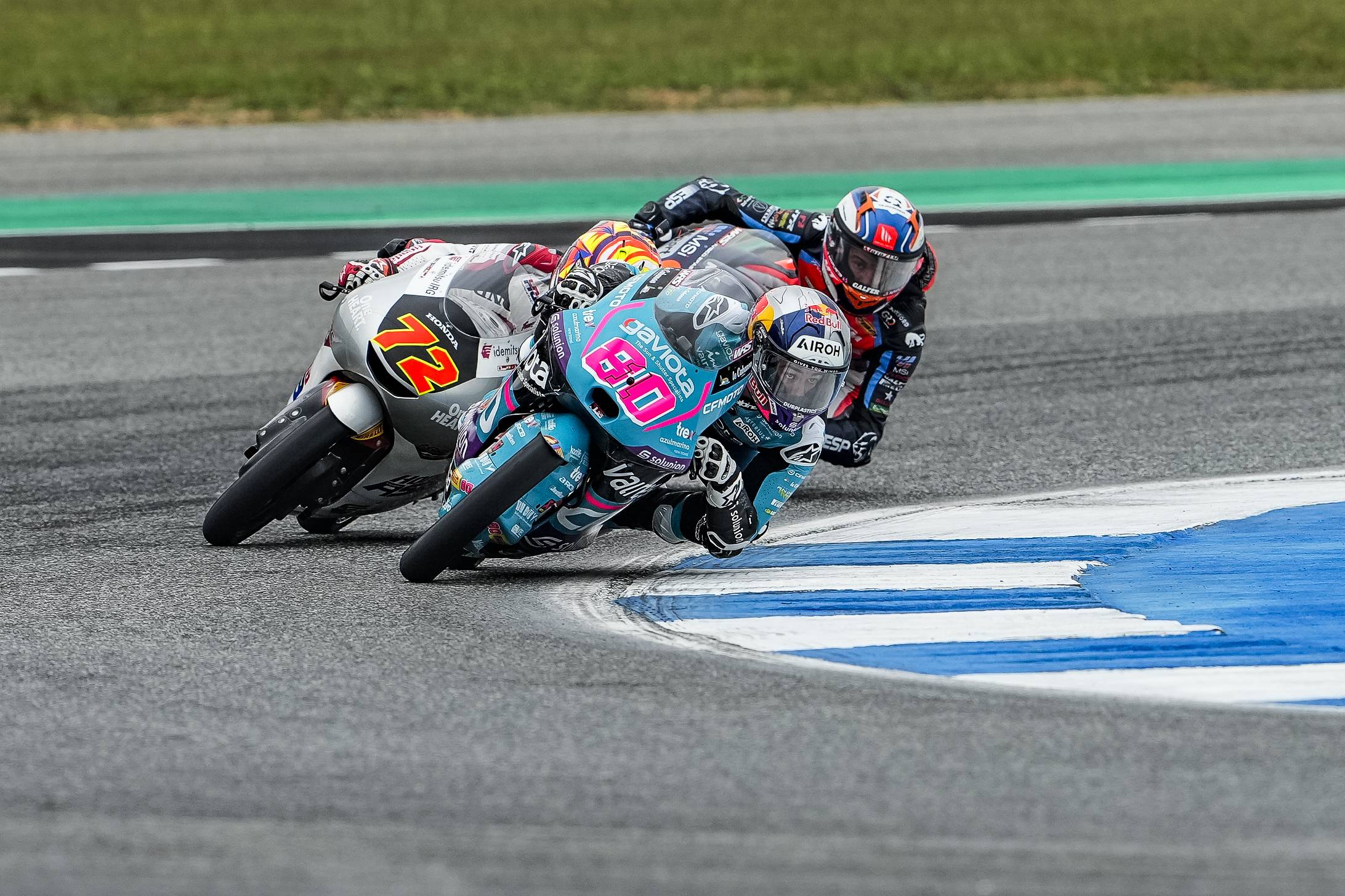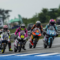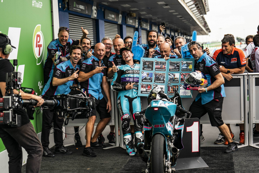 El campeón del mundo de Moto3 sigue haciendo historia. Con la victoria en Buriram, Alonso ya es el piloto con más triunfos en un mismo año en la categoría pequeña, superando el récord de Valentino Rossi de 1997. A su vez, el colombiano se ha convertido en el primer piloto de la historia de Moto3 en ganar cinco carreras de forma consecutiva. Después de haber disputado tanto los entrenamientos como el cronometrado en seco y con altas temperaturas, a aparición de la lluvia durante la mañana de carreras ha hecho que cambiasen las condiciones. Como consecuencia, se ha reducido la distancia de la carrera de 19 a 12 vueltas para dejar más tiempo a los pilotos para comprobar las condiciones del asfalto. Sin embargo, en el momento de la salida, la pista estaba prácticamente seca y los pilotos han optado por montar gomas de seco. El piloto del CFMOTO Gaviota Aspar Team David Alonso partía desde la quinta plaza, pero no ha tardado en recuperar posiciones para permanecer entre los tres primeros durante toda la prueba. Cuando faltaban cuatro vueltas para el final, Alonso ha superado a Taiyo Furusato para ponerse al frente y, aunque Iván Ortolá le ha adelantado en el último giro, el campeón no ha tardado en devolvérselo para sumar su duodécima victoria del año. La lucha por las otras dos posiciones del podio también ha permanecido abierta hasta el final, con cuatro pilotos en la batalla. Luca Lunetta ha terminado segundo y Collin Veijer, tercero.