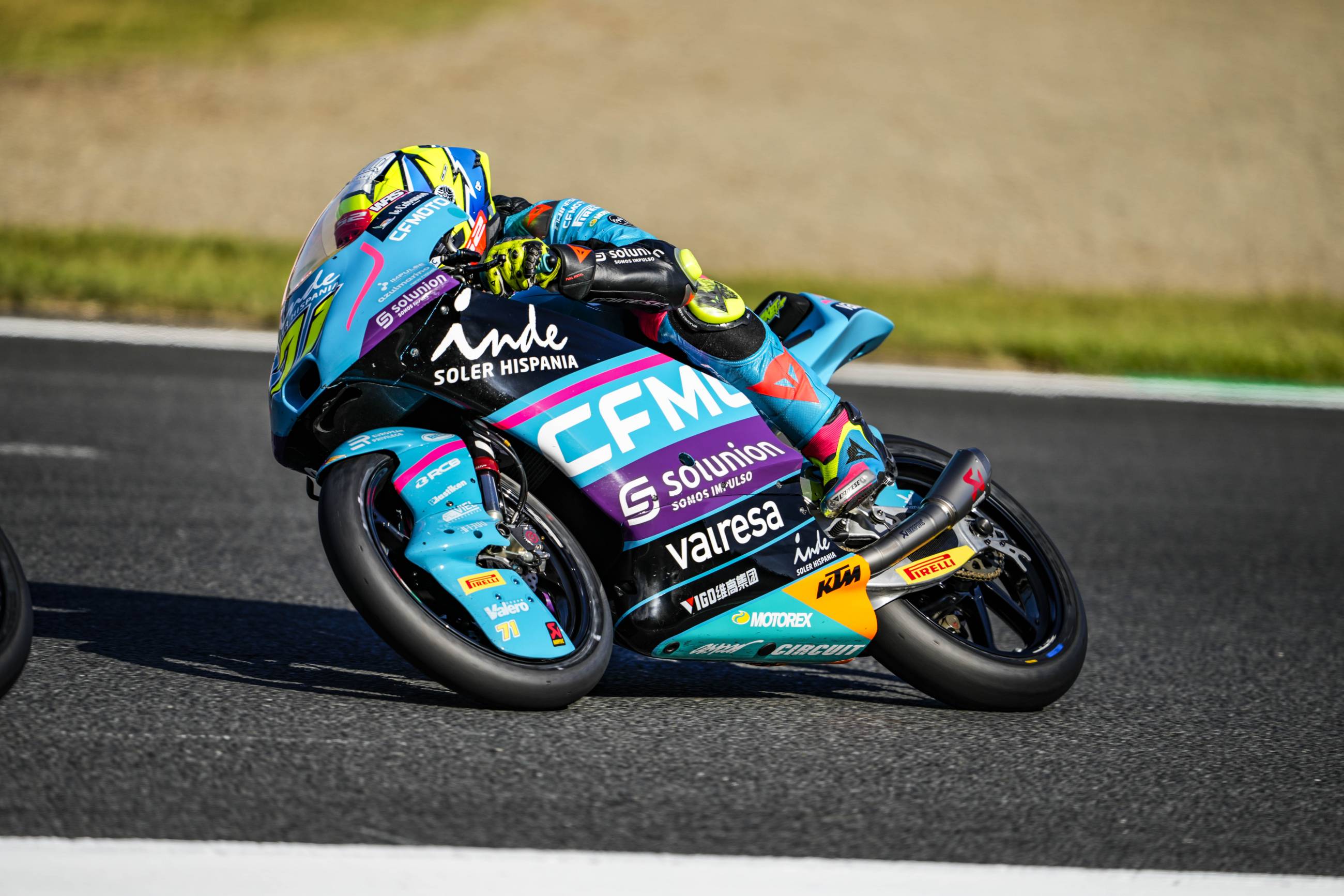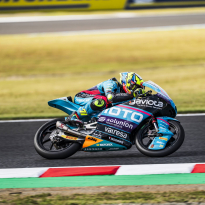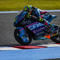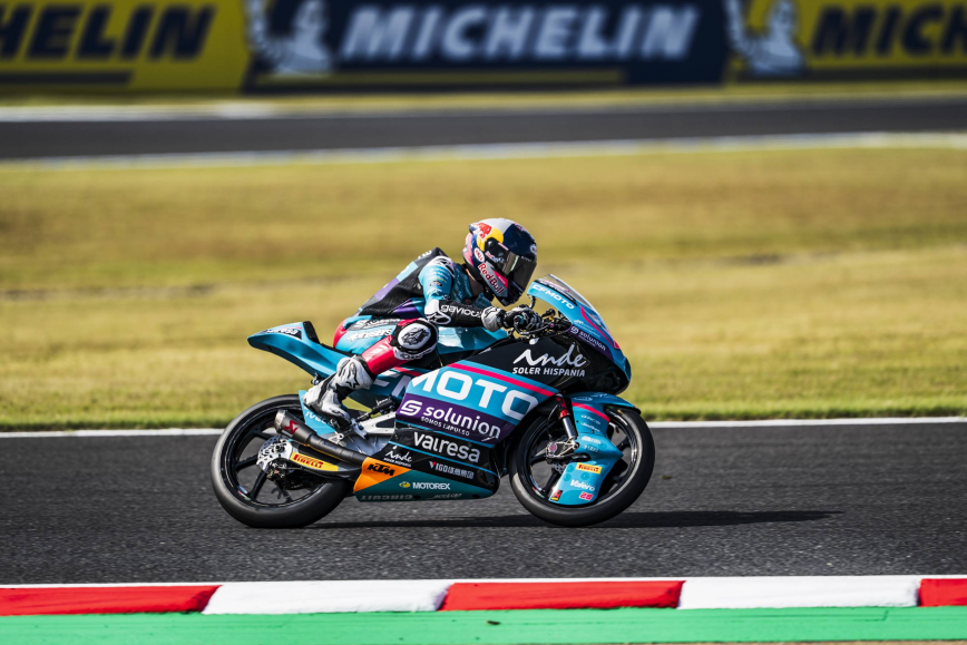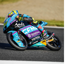 Los aficionados presentes en el Gran Premio de Japón han sido testigos de nuevos progresos de los pilotos del CFMOTO Gaviota Aspar Team. Tanto Máximo Quiles como Dennis Foggia han trabajado en el planteamiento de cara a la carrera de este domingo durante el entrenamiento libre de esta mañana. Ambos pilotos han finalizado en el top 10, con Quiles en quinta posición pese a haber sufrido una caída. Con la Q2 asegurada, ambos pilotos han salido a la pista por la tarde con las ideas claras y dispuestos a seguir progresando para optar a las primeras posiciones de la parrilla de salida. Máximo Quiles ha seguido mejorando sus tiempos y ha pilotado en solitario para seguir ganando confianza en el trazado japonés. El debutante de la categoría pequeña ha dado lo mejor de sí mismo hasta los últimos minutos, cuando ha completado su mejor vuelta. Gracias a un tiempo de 1:55.626 el español comenzará la carrera desde la octava plaza, a cuatro décimas de la pole. Por otro lado, Dennis Foggia también ha tenido que emplearse al máximo para conseguir una buena posición. El italiano ha sido capaz de rodar más de medio segundo más rápido que en la jornada anterior y, consciente de la gran competitividad de todos los pilotos durante el cronometrado, ha aprovechado cada segundo de la sesión. Foggia ha conseguido su mejor tiempo en la última vuelta: un 1:55.444 que le colocaba en la décima posición. Sin embargo, la sanción recibida este sábado por pilotar lento en algunos sectores le obligará a remontar posiciones desde la última plaza de la parrilla de salida.