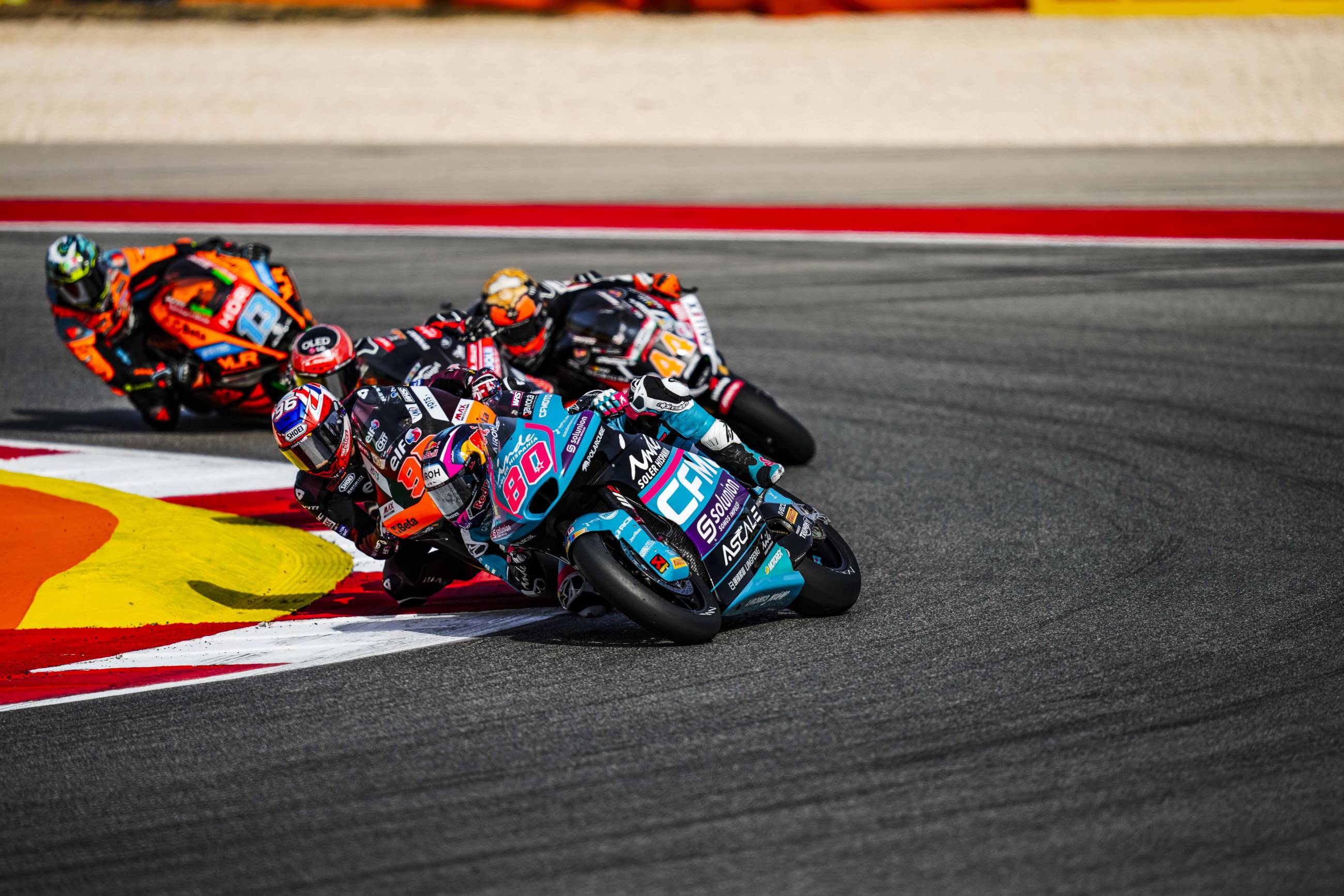 Diogo Moreira dejó casi sentenciado el título de Moto2 con su victoria en Portugal. El piloto brasileño aumentó todavía más su ventaja en la clasificación con respecto a Manu González, que finalizó sexto en Portimao, y llega a Valencia con un colchón de 24 puntos. De esta forma, Moreira será campeón si queda entre los catorce primeros, independientemente del resultado del español. A González solo le vale ganar y que Moreira termine, como mucho, decimoquinto, si quiere arrebatarle el título. Por otro lado, la medalla de bronce se decidirá entre tres pilotos: Barry Baltus, que es tercero con 236 puntos; Aron Canet, cuarto con 226 puntos, y Jake Dixon, quinto con 215.
